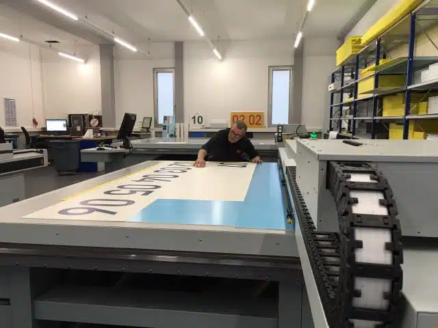 Mit dem neuen Großformatdrucker inklusive Weiterverarbeitungsstraße können wir nicht nur flexible Materialien, sondern auch Kunststoff- und Magnetträger direkt bedrucken. Bis zu einem Format von 3,05 x 2,5 m. Noch dazu erscheinen Logos, Symbole oder Barcodes in nahezu fotografischer Qualität – im Fall von Barcodes erleichtert es das spätere Auslesen.