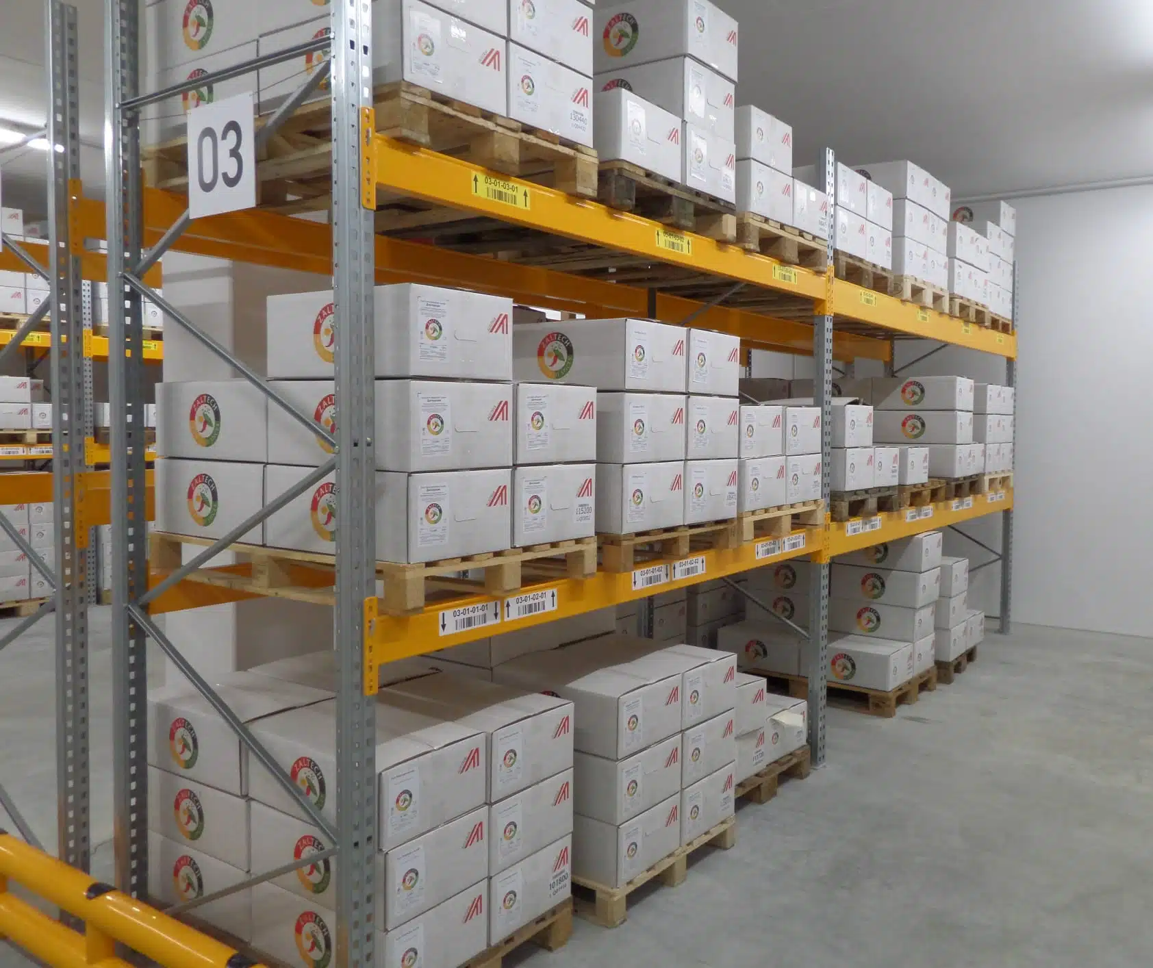 In den verschiedenen Lagern, darunter ein Rohwarenlager mit 3.500 Palettenplätzen, verteilt auf 12 Regalreihen mit bis zu 9 Metern Höhe, ein Reinlager für Gewürze auf Hygienepaletten, diverse Produktionslager sowie Reinstlager für Kleingebinde und Flüssigkeiten, sorgen 60 zwischen den Regalträgern befestigte Gangschilder sowie 25 Blocklagerschilder für eine schnelle Orientierung der Mitarbeiter. Die barcodierten Blocklagerschilder bilden die logistischen Warenzonen, z.B. Wareneingang, Umverpackung, Lift etc. ab. In planer Ausführung sind sie direkt an Wand bzw. Maschinen montiert. In abgewinkelter Form erhöhen sie die Lesbarkeit, wenn sie von der Decke abgehängt werden. Bei Zaltech hängen sie in rund viereinhalb Meter Höhe über dem Boden, um Maschinen zu bezeichnen – an Knotenketten befestigt, um die Distanz von der Hygienedecke, in der sämtliche Versorgungsleitungen verlegt sind, zum Boden zu verringern.