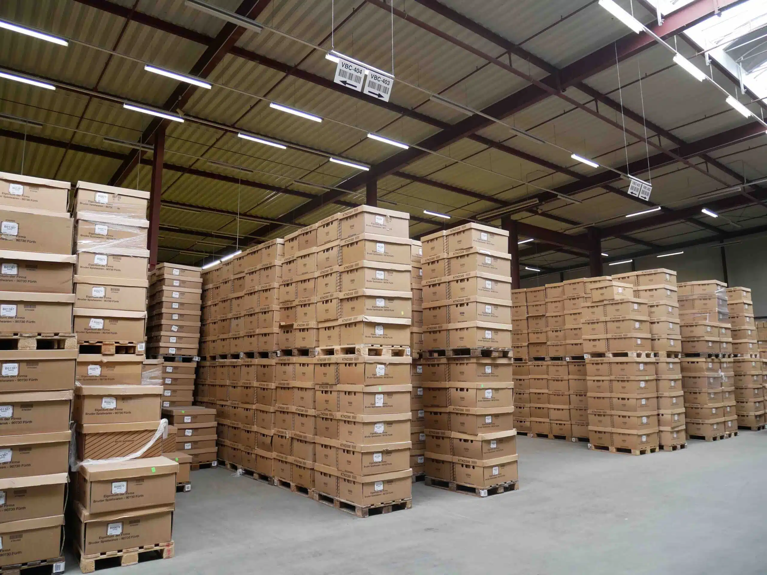 Bei Bruder läuft die Produktion zwar gleichmäßig über das Jahr, jedoch schwankt der Absatz deutlich: Ab Jahresmitte steigt er zunehmend, erreicht im Herbst seinen Höhepunkt, der bis zum Weihnachtsgeschäft anhält. Um Fertigware für die Hochsaison vorzuhalten, hat BRUDER jetzt in Veitsbronn eine Lagerhalle mit 20.000 m2 Lagerfläche als Nachschublager für das Versandlager gemietet. Hier werden auf Vorrat produzierte Fertigwaren, insgesamt 400 verschiedene Artikel, aber auch Halbfertigwaren für die Produktion gelagert. Tägliche LKW-Shuttlefahrten versorgen Produktion und Versand in Fürth-Burgfarnbach.