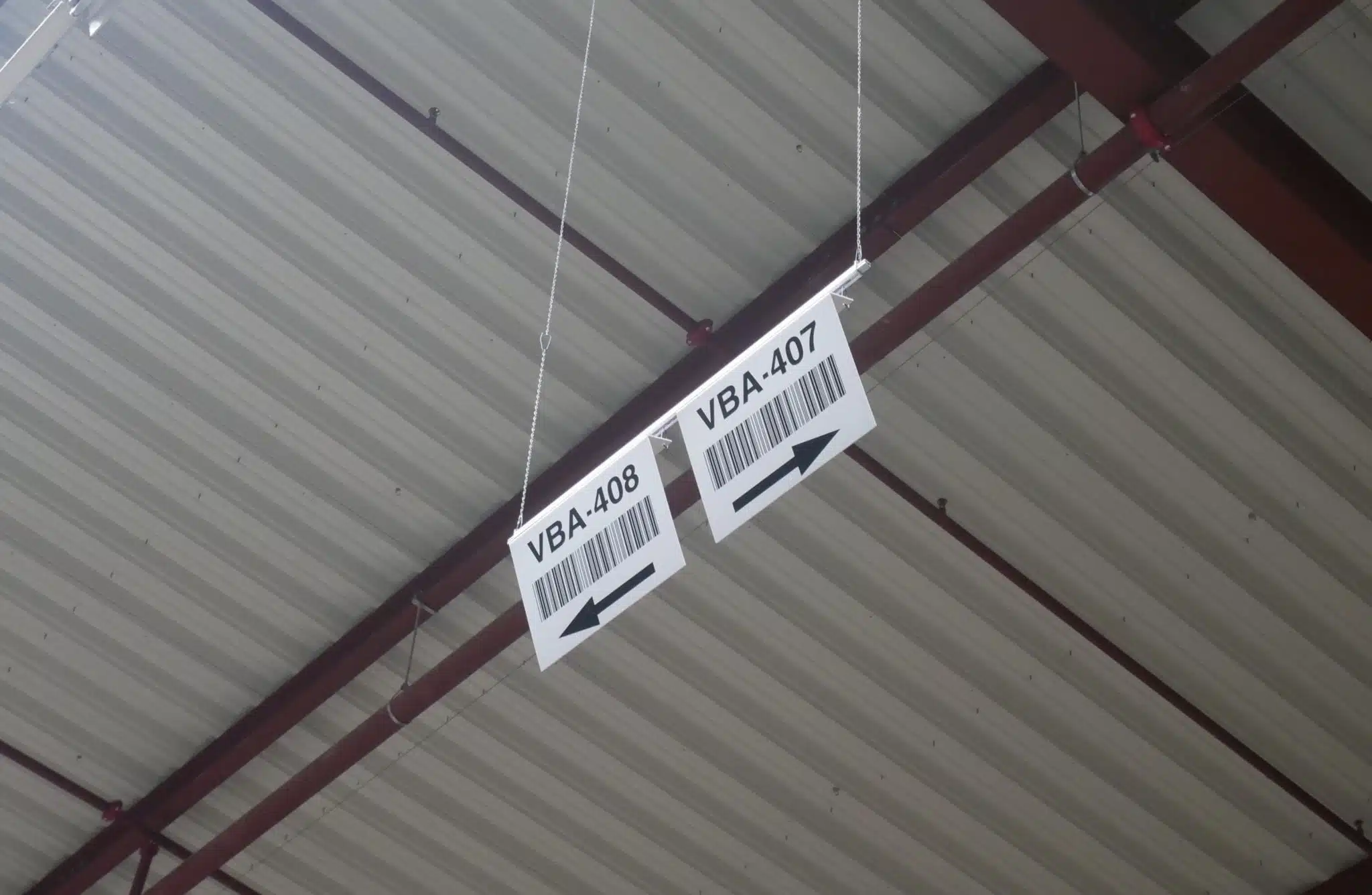 Rund 440 Stellplätze hat das Blocklager, die mit frei hängenden Schildern von ONK gekennzeichnet sind. „Anders als Bodenmarkierungen, die aufgrund ständiger Staplerfahrten und hohen Rangieraufkommens stark beansprucht werden, lassen sich die Barcodes auf den Schildern dauerhaft fehlerfrei lesen“, sagt Henn. „Da die Halle gemietet ist, konnten wir die Schilder nicht an die Decke bohren und haben uns auch deshalb für die Lösung von ONK entschieden, vor allem aber, weil das System ausgesprochen flexibel ist. Änderungen an den Lagerplätzen lassen sich mittels der Lochleisten und Magnete relativ einfach umsetzen.“ Bei der Befestigung der Schilder im Januar 2018 hat das ONK-Team zunächst stark haftende Neodym-Magnete an der Decke befestigt, an deren Ösen eine höhenverstellbare Knotenkette mittels Drahtspange befestigt ist. Am unteren Ende der Kette wiederum ist eine Lochleiste angebracht, an der das Schild mit einer Drahtspange eingehängt ist.