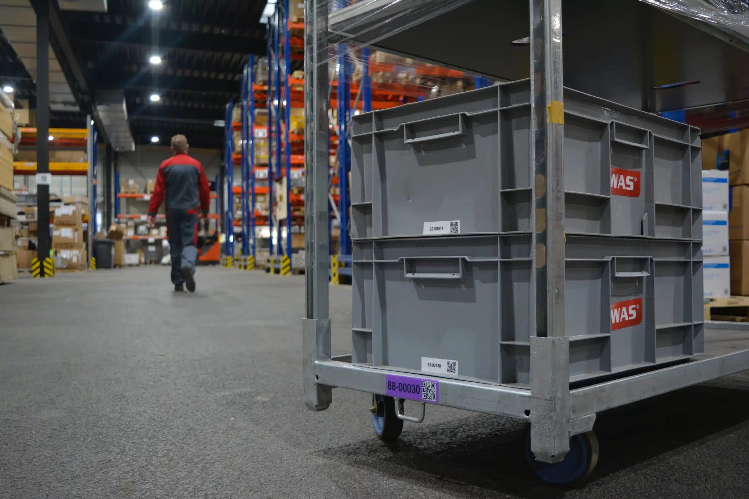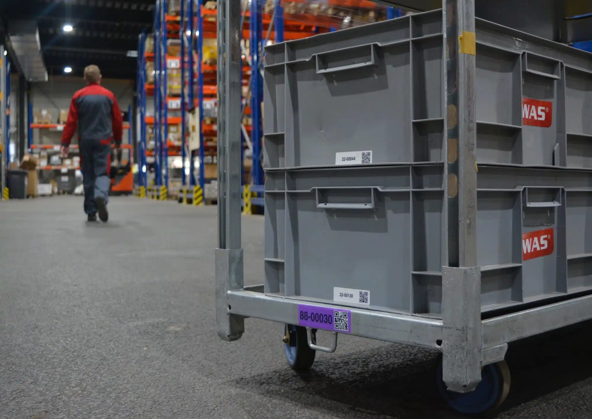 „Da sich das Logistikzentrum zehn Kilometer von den Fertigungslinien entfernt befindet, ist eine Nachverfolgbarkeit der Transportbehälter und Wagen von großer Bedeutung.“ Fast 5.400 Kisten, Schütten und Kommissionierwagen hat WAS mit barcodierten Folienetiketten von ONK gekennzeichnet. In den aufgedruckten und an die Scannercodierung von WAS angepassten QR-Codes ist die jeweils mehrstellige Lagerplatzkoordinate verschlüsselt. Damit die Etiketten auf den Warenträgern den Belastungen beim Transport vom Logistikzentrum zu den Fertigungslinien standhalten, sind sie mit Schutzlaminat versehen.