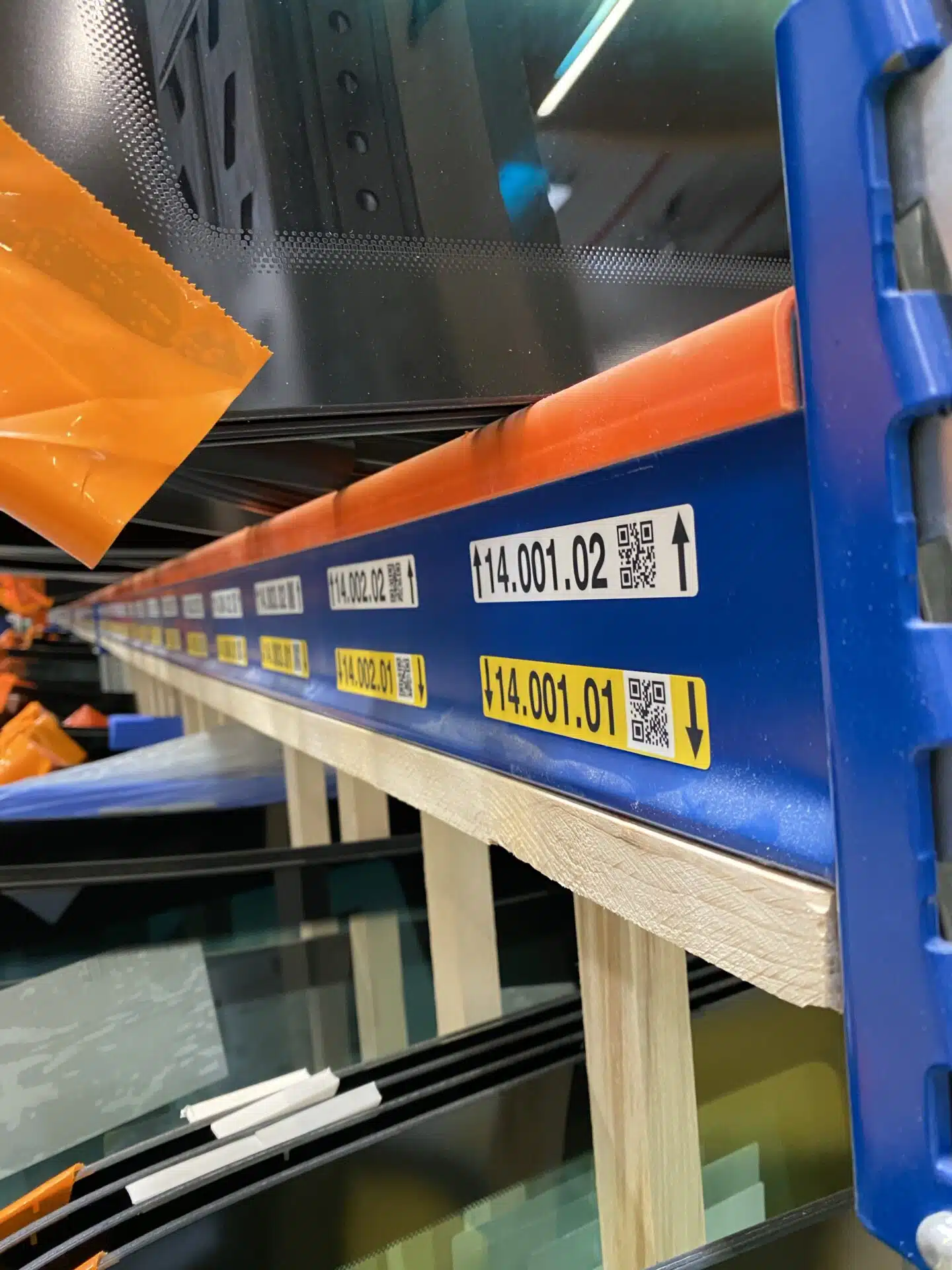 Einzelne Autoscheiben wiederum lagert Saint-Gobain Autover in individuell gefertigten Fachbodenregalen, deren höhere Ebenen vom Boden problemlos scannbar sind. An jeden einzelnen der mehr als 10.000 Stellplätze hat ONK selbstklebende Etiketten angebracht. Sie bilden die neunstellige Lagerplatzkoordinate in Klarschrift und als 2D-Code ab. Damit die Etiketten der hohen Beanspruchung lange standhalten, sind sie nicht nur aus Folie, sondern zusätzlich noch mit einem Schutzlaminat überzogen. Anders als die mit selbstklebenden Etiketten dauerhaft gekennzeichneten Stellplätze für Autoscheiben ist das Zubehör in Fachbodenregalen mit mehreren Hundert Einstecketiketten beschriftet. So lässt sich die Kennzeichnung bei Bedarf schnell austauschen oder das Fach verkleinern bzw. vergrößern. Auch diese Etiketten bilden die Koordinate klarschriftlich und barcodiert ab und sind zum Schutz vor hoher Beanspruchung in passgenau zugeschnittene Etikettenhalter eingeschoben.