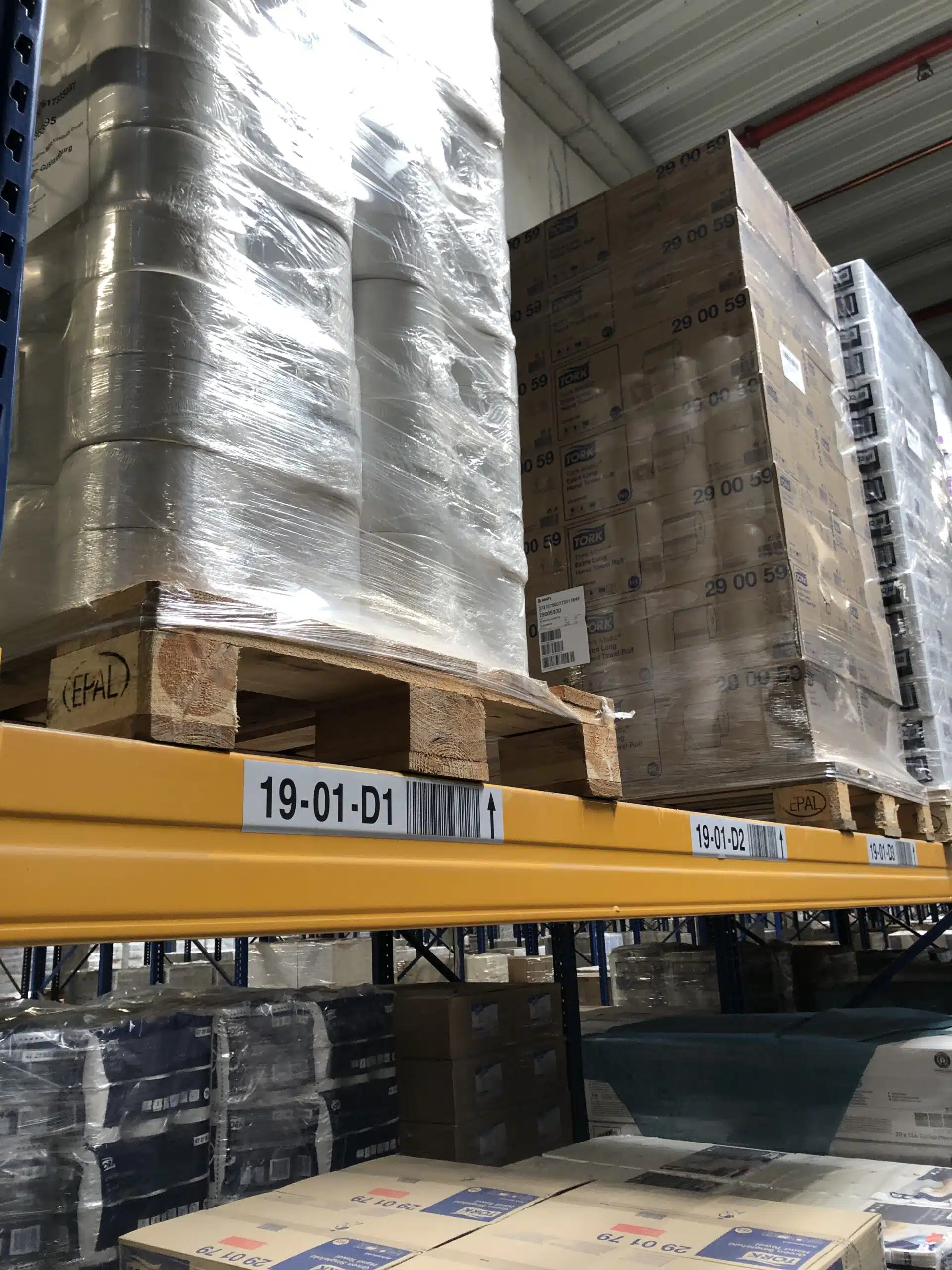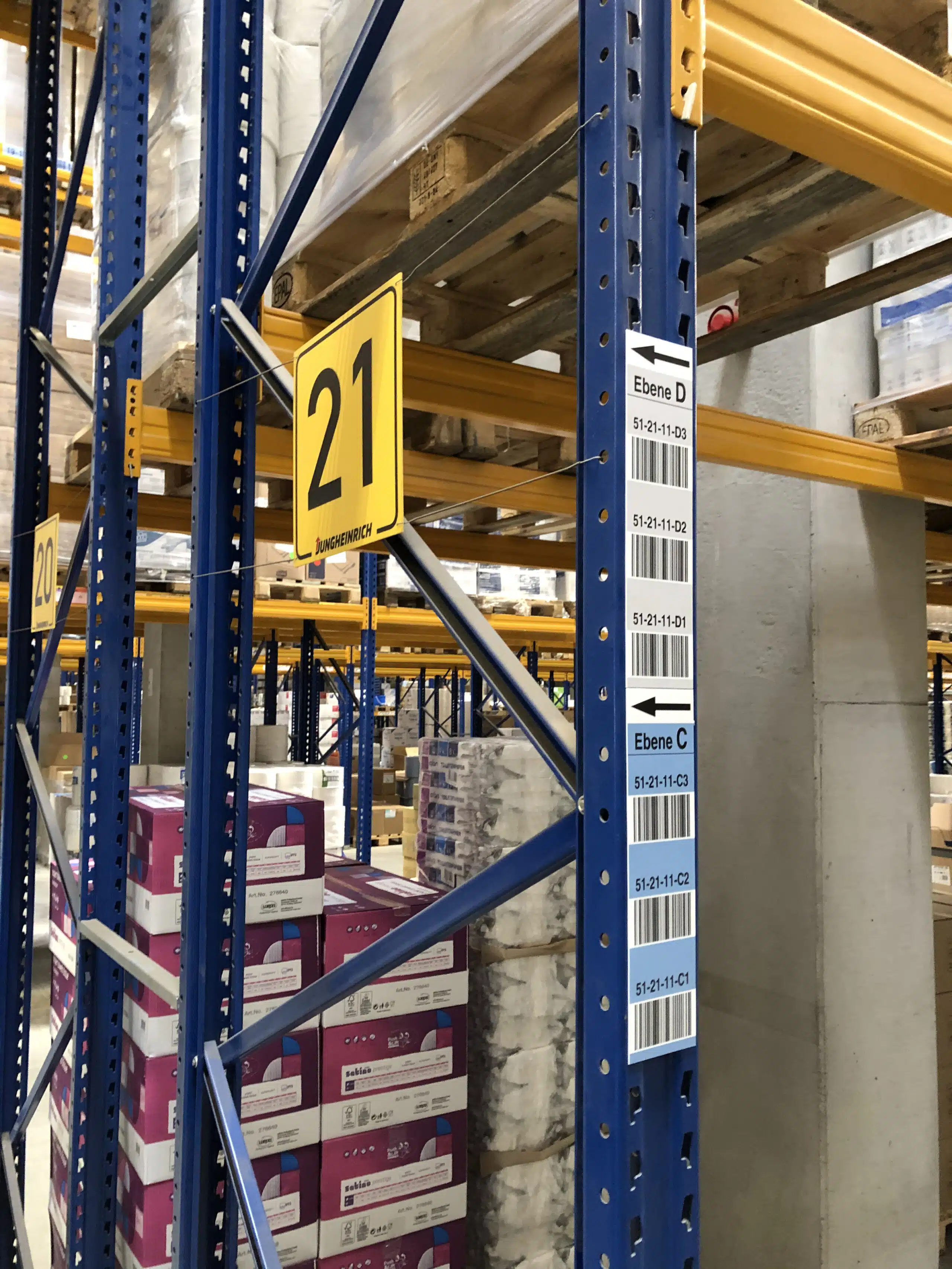 Zur jeweiligen Regalreihe werden die Kommissionierer durch Gangschilder an den Stirnseiten der Regale geleitet. An den Durchfahrten weisen dann farbige Man-down-Etiketten im Hochformat mit übereinander gedruckten Barcodes und Richtungspfeilen den Staplerfahrer zu den verschiedenen Stellplätzen. Die Herausforderung war das u-förmige Profil des Ständerrahmens. Weil Etiketten hier nicht ganzflächig aufliegen, würden Papier- bzw. Folienetiketten mit der Zeit durch die Beanspruchung reißen – die Barcodes ließen sich dann nicht mehr scannen. Daher hat ONK die Etiketten für die Regalrahmen aus Hartschaum-PVC zugeschnitten. Befestigt werden sie mittels extrastark haftender Klebestreifen. Darauf sind bis zu drei Barcodes pro Ebene gedruckt, weil jedes Fach dreifach belegt werden kann. Die verschiedenen Ebenen haben einen eigenen Farbcode, z.B. Hellblau für C und Hellgrau für D.