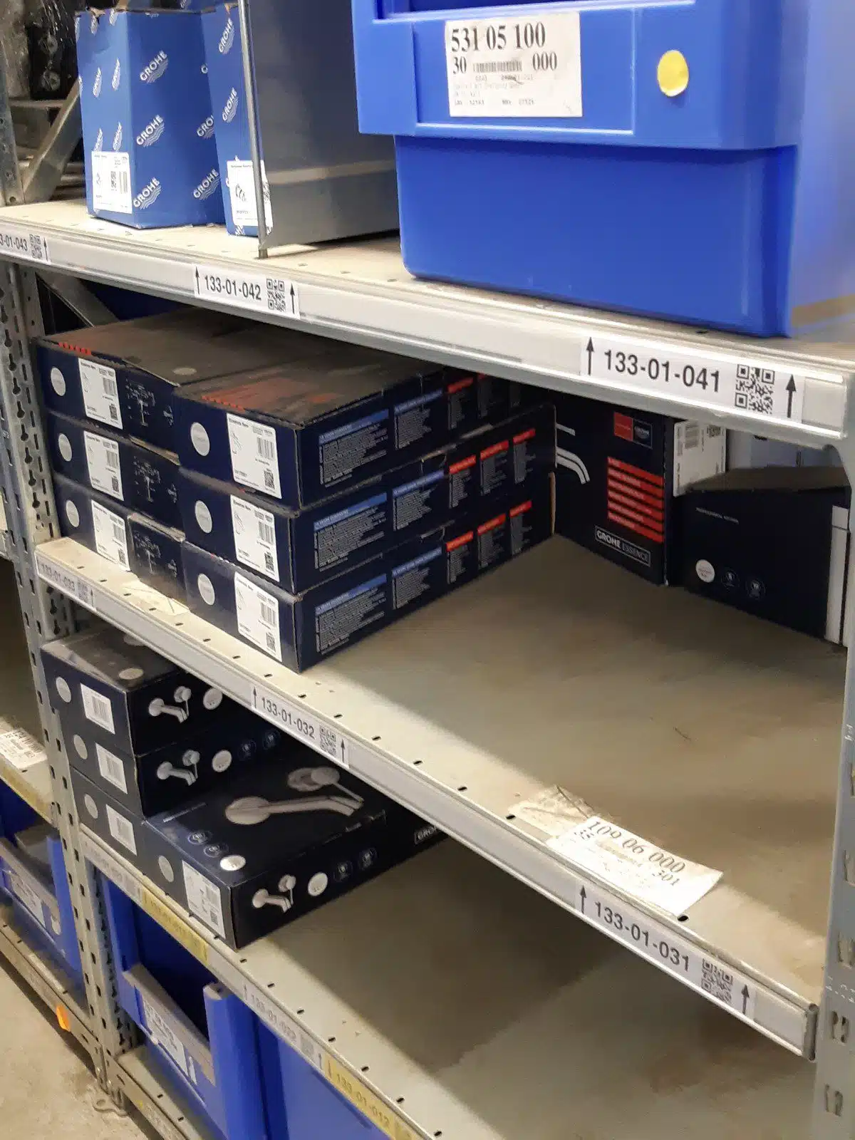 Die dreigeschossige Fachboden-Regalanlage mit integrierter Behälter-Fördertechnik wiederum hat 27.000 Stellplätze. Hier werden u.a. kleinere Produkte und Waren sowie Verbindungs- und Befestigungsteile bevorratet. Je nach Produkt und Umschlagshäufigkeit sind mehrere Plätze mit demselben Produkt belegt. Um immer wieder auf wechselnde Sortimente reagieren zu können, sind diese lebenden Stellplätze mit austauschbaren Einstecketiketten gekennzeichnet. Eingesteckt sind die mit klarschriftlicher und barcodierter Stellplatzkoordinate bedruckten Etiketten in bis zu 87 cm lange selbstklebende Halter. So lassen sich die Kennzeichnungen bei Bedarf schnell austauschen oder Fächer verkleinern bzw. vergrößern. Die Einstecketiketten kommen auch an Palettenstellplätzen mit Schnelldrehern sowie im Rohr- und Archivlager zum Einsatz.