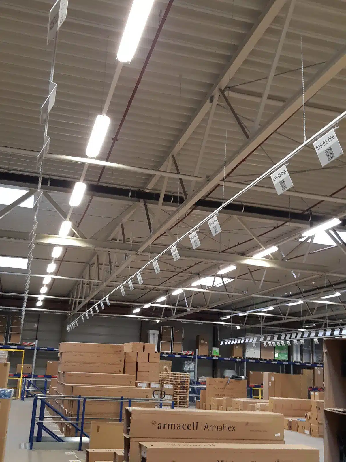 Über Stellplätzen auf den Bühnen, auf denen hauptsächlich Isolierungen lagern, haben wir Schilder mittels einer Unterkonstruktion von der Hallendecke abgehängt. Vorher waren dort Markierungen auf dem Boden, die meistens gar nicht mehr sichtbar waren. Anders als Bodenmarkierungen können die abgehängten Schilder nicht zugestellt werden. Auch diese Kennzeichnung ist flexibel. Ändert sich die Anordnung im Lager, können die mittels Drahtspangen in Lochleisten eingehängten Schilder einfach umgehängt werden.