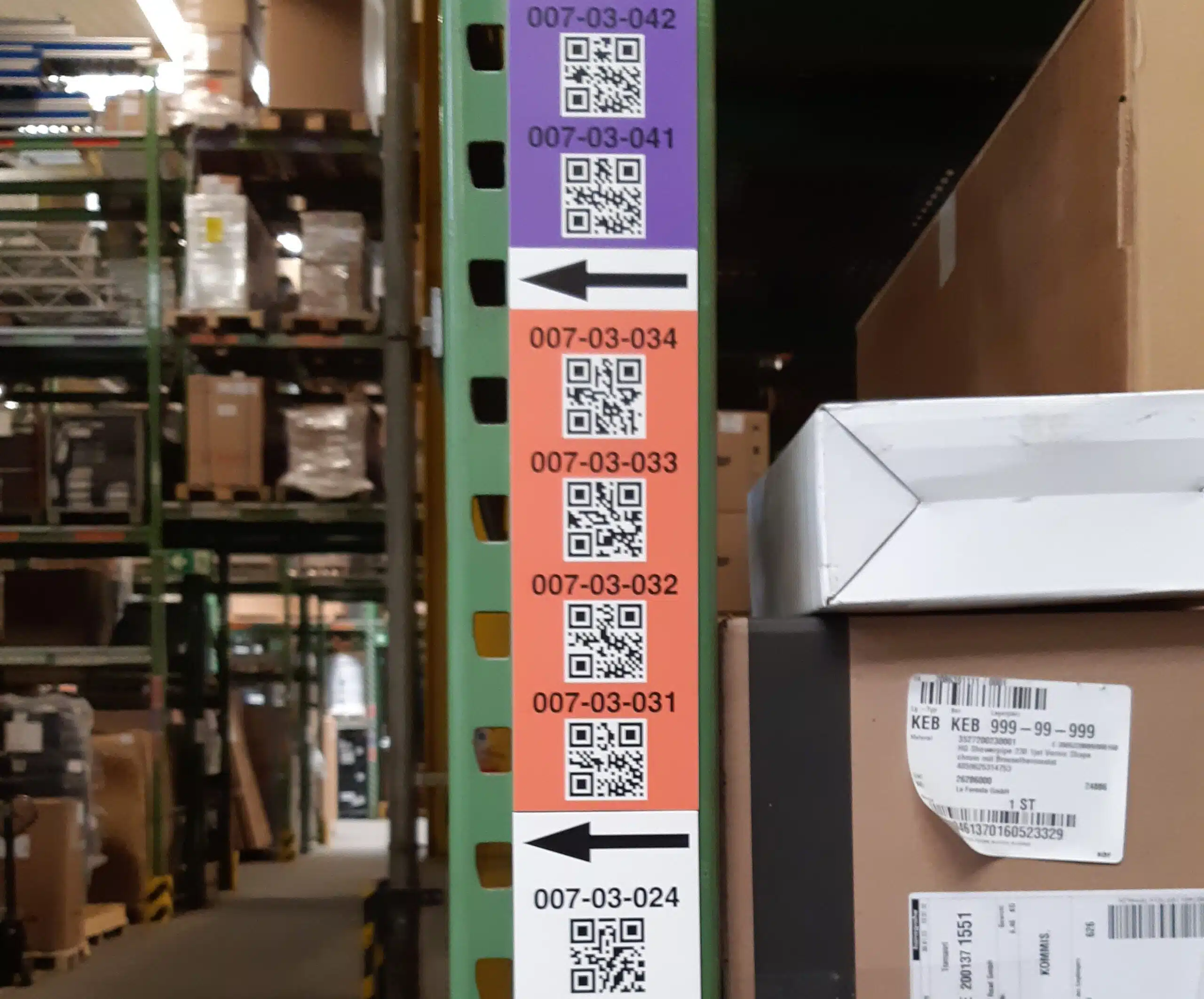 In der Paletten-Regalanlage stehen in einem Schmalgang- und einem Breitganglager sowie einer Einfachregalzeile insgesamt 13.000 Plätze zur Verfügung. Sie nehmen Paletten in Standard- und Sonderformaten sowie groß dimensionierte oder sperrige Waren auf. Diese Stellplätze haben wir mit einem Etiketten-Set gekennzeichnet. Es besteht aus einem Man-down-Etikett, das an der untersten Traverse befestigt ist und den darunter sowie alle direkt darüber liegenden Stellplätze abbildet. Damit sich die bis zu acht nebeneinander aufgedruckten Barcodes schnell und fehlerfrei der richtigen Ebene zuordnen lassen, hat jeder eine individuelle Hintergrundfarbe, z.B. Orange für Ebene 3 bzw. Hellblau für Ebene 8. Dieser individuelle Farbcode findet sich auch auf den einzelnen Stellplatzetiketten wieder, die ab Ebene 3 angebracht sind. Die Vorteile des Etiketten-Sets: Die Barcodes lassen sich sicher vom Boden aus abscannen, das Einzelplatzetikett dient als Inventuretikett und sollte mit der Zeit ein Barcode auf einem der beiden Etiketten nicht mehr lesbar sein, dient das zweite als Sicherheit.