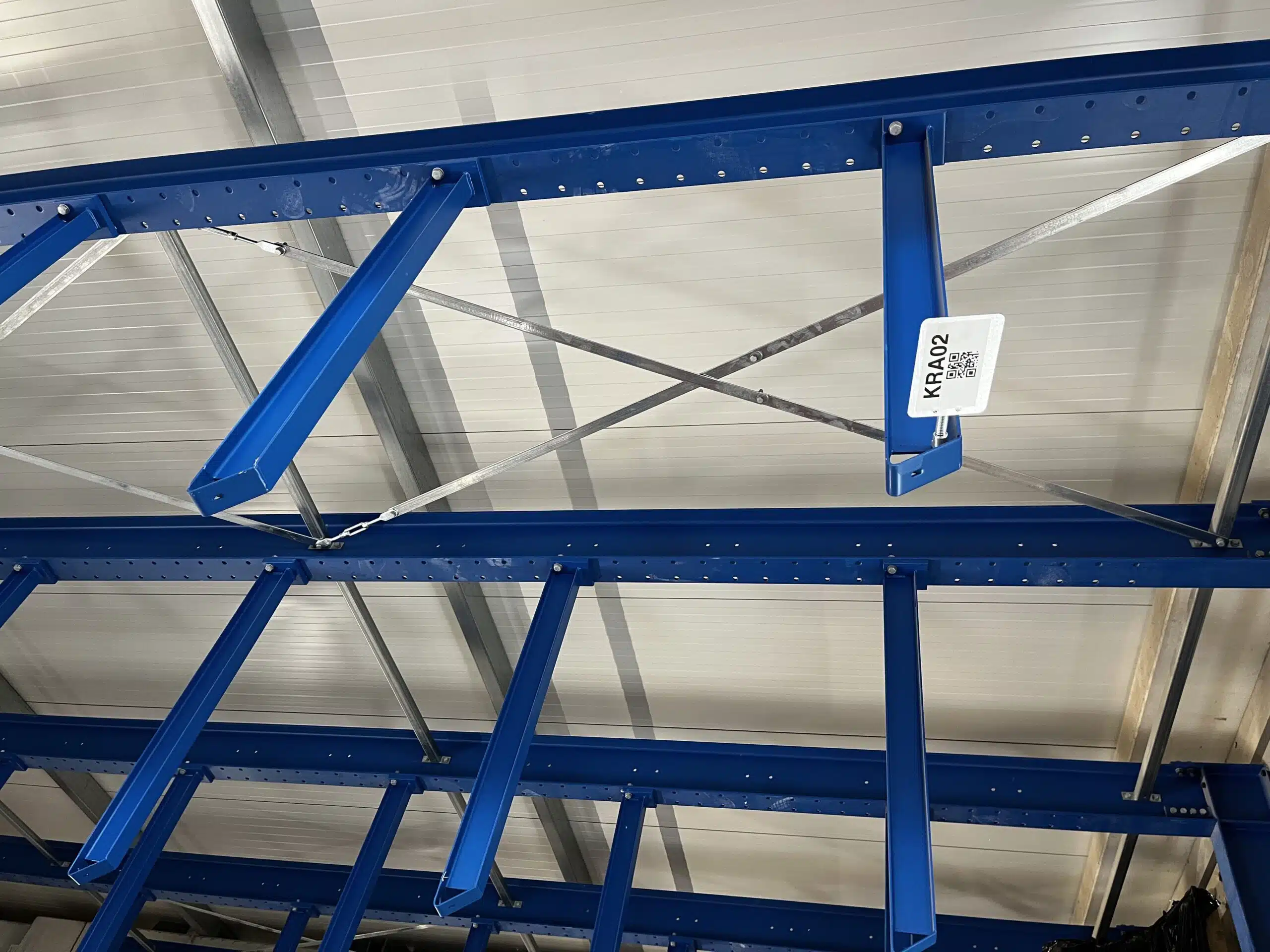 An den Lagerplätzen in den Kragarmregalen – hier lagern auf 64 Ebenen Güter bis sieben Meter Länge – sind aufgrund der fehlenden Auflagefläche Halter aus verzinktem Stahlblech angebracht. Befestigt sind sie mittels Knebelschrauben, die versehentliche Berührungen abfedern. Darauf sind die barcodierten Stellplatzetiketten geklebt. Für Durchfahrten sowie die Regalreihen in den Paletten- und Fachbodenbereichen hat ONK Schilder aus PVC-Hartschaum in verschiedenen Größen geliefert. An den Fachbodenregalen sind sie mittels Pendelhaltern, die bei Berührung nachgeben, und an den Palettenregalen sowie Durchfahrten mittels Vorlochung an Stahlspiralen befestigt.
