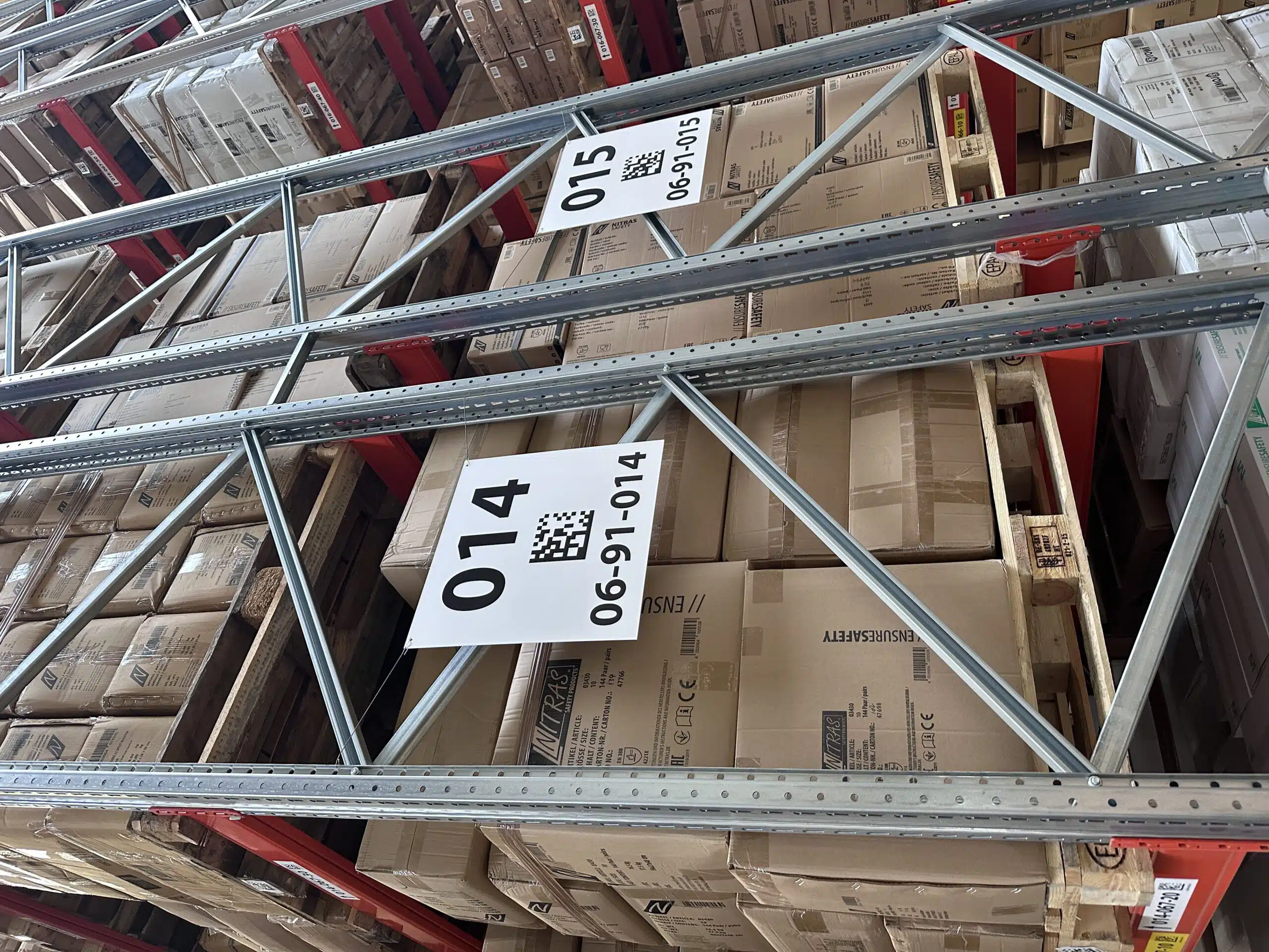 Im zweiten Schritt hat ONK das entwickelte Etikettendesign sowie Scanmuster mit Echtdaten zum ausgiebigen Testen durch die AS Arbeitsschutz GmbH erstellt. Nach Freigabe versah das Montageteam von ONK im Mai die 24 Regalreihen im neuen Schmalgangregallager mit Gangschildern. Anschließend kennzeichnete es jeden der 12.000 Stellplätze auf bis zu elf Ebenen – bei laufenden Bauarbeiten.
