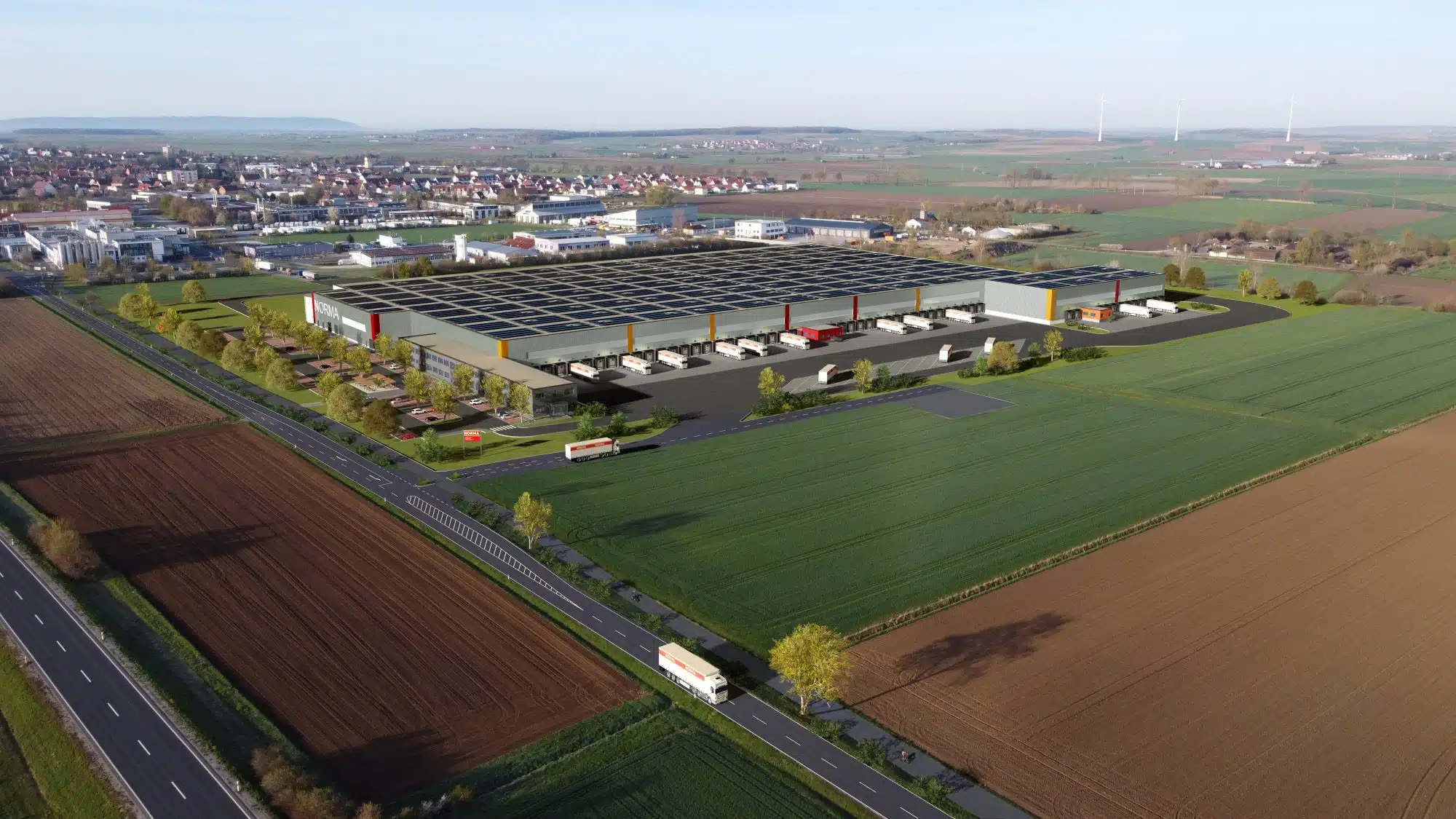 Eingebunden ist der Standort Gerolzhofen in eine Reihe von 16 Logistikzentren und stellt zusätzlich sicher, dass alle NORMA-Filialen täglich mit frischen Waren versorgt werden. Im Vergleich zum bisher zuständigen Verteilerzentrum in Röttenbach bei Erlangen verkürzen sich Lieferstrecken und damit auch die Lieferzeiten erheblich. Rund 600.000 Streckenkilometer pro Jahr werden bei circa 18.500 Touren mit insgesamt etwa 58.000 Abladestellen eingespart. Mit 35 Millionen Euro ist der Neubau in Gerolzhofen das größte Einzelinvestment des Unternehmens und umfasst neben einem knapp 2.000 Quadratmeter großen Verwaltungsgebäude eine rund 34.000 Quadratmeter große Lagerhalle. Sie kann auf bis zu 50.000 Quadratmeter erweitert werden und schließt derzeit einen Blocklagerbereich auf einer Fläche von circa 5.000 Quadratmetern ein. Dort werden Getränke und Toilettenpapier auf rund 1.800 Stellplätzen, teilweise zwei Paletten übereinandergestapelt, gelagert. Bei der Kennzeichnung der Stellplätze nutzt NORMA eine flexible Lösung der ONK GmbH.
