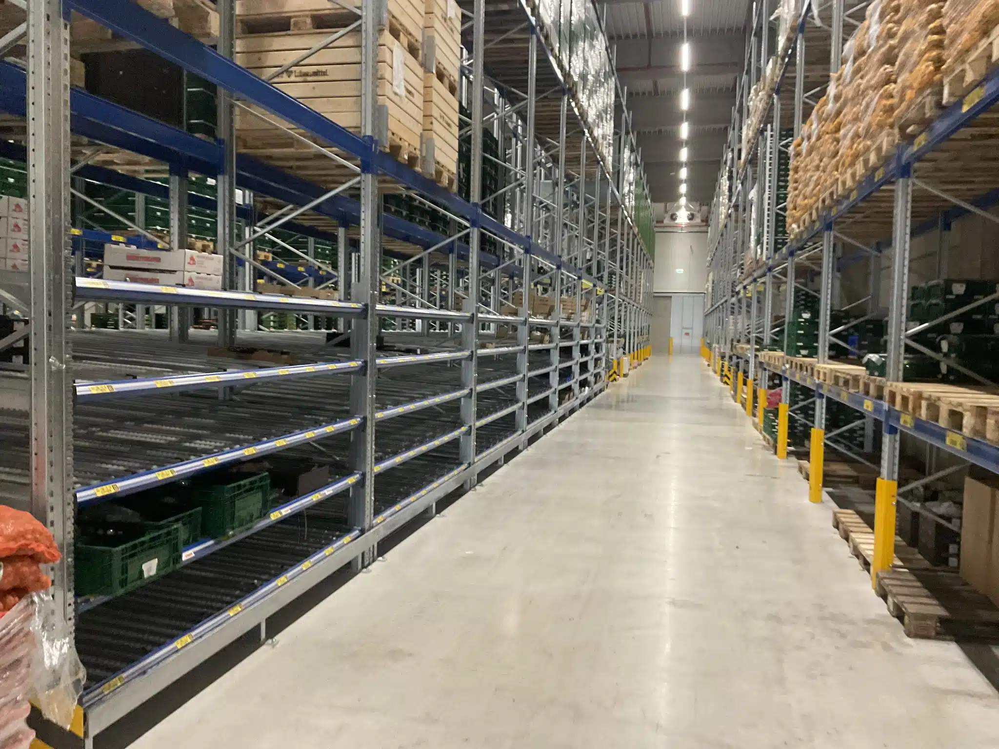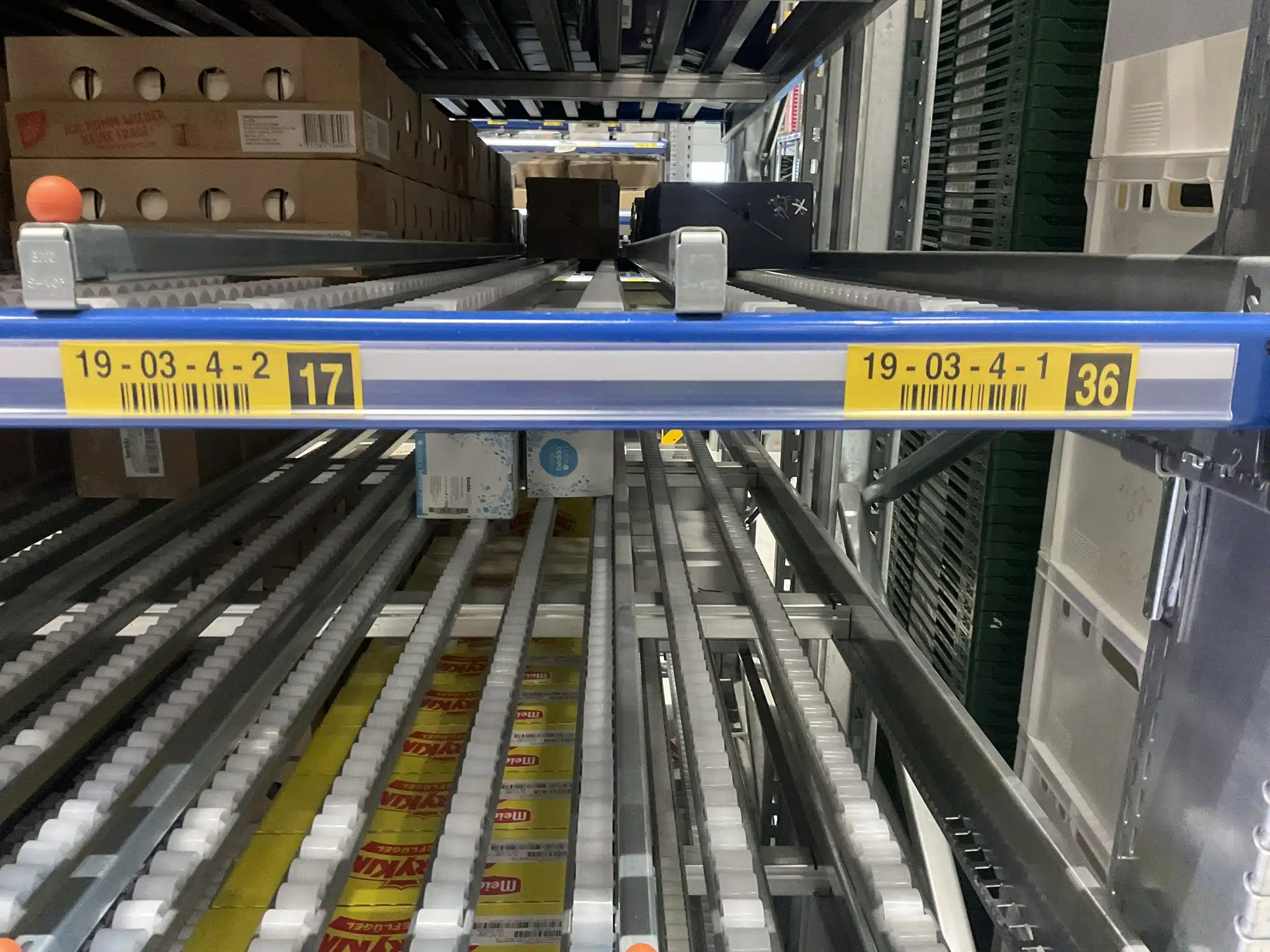 Die Durchlaufregale wiederum wurden mit 390 selbstklebenden Etikettenhaltern mit Staubschutzkante mit auswechselbaren, bedruckten Einstecketiketten bestückt – 3.510 hat ONK hierfür geliefert. „In diesen Regalen lagern diverse Frischeprodukte mit einer meist geringeren Umschlaghäufigkeit, für die ein anderer Regal- oder Blocklagerplatz unwirtschaftlich wäre. Mithilfe der auswechselbaren Etiketten lassen sich die Fächer bei Vergrößerung oder Verkleinerung der Flächen beliebig anpassen“, sagt Kerkenhoff.