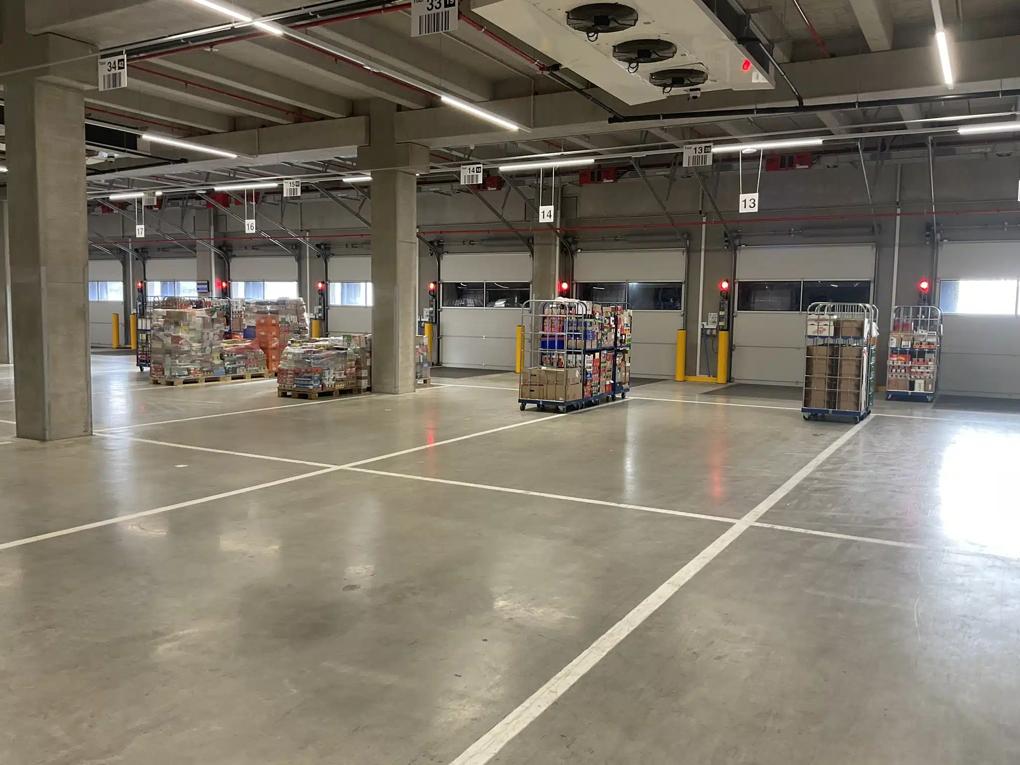 Auch die Bodenmarkierungen im Frischezentrum wurden von ONK ausgeführt. Verwendet wurde eine 2-Komponenten-Farbe in Verkehrsgelb und Weiß zur Kennzeichnung von Fahr- und Fußwegen sowie Blocklagerflächen – insgesamt ca. 1.500 laufende Meter. Für eine längere Haltbarkeit sind die Markierungen versiegelt. Mehrere Meter farbgestrichene Zebrastreifen sowie gelb-schwarz schraffierte Bodenmarkierungen mit Klarlacküberzug unter anderem für Sperrflächen ergänzen die Bodenmarkierungen.