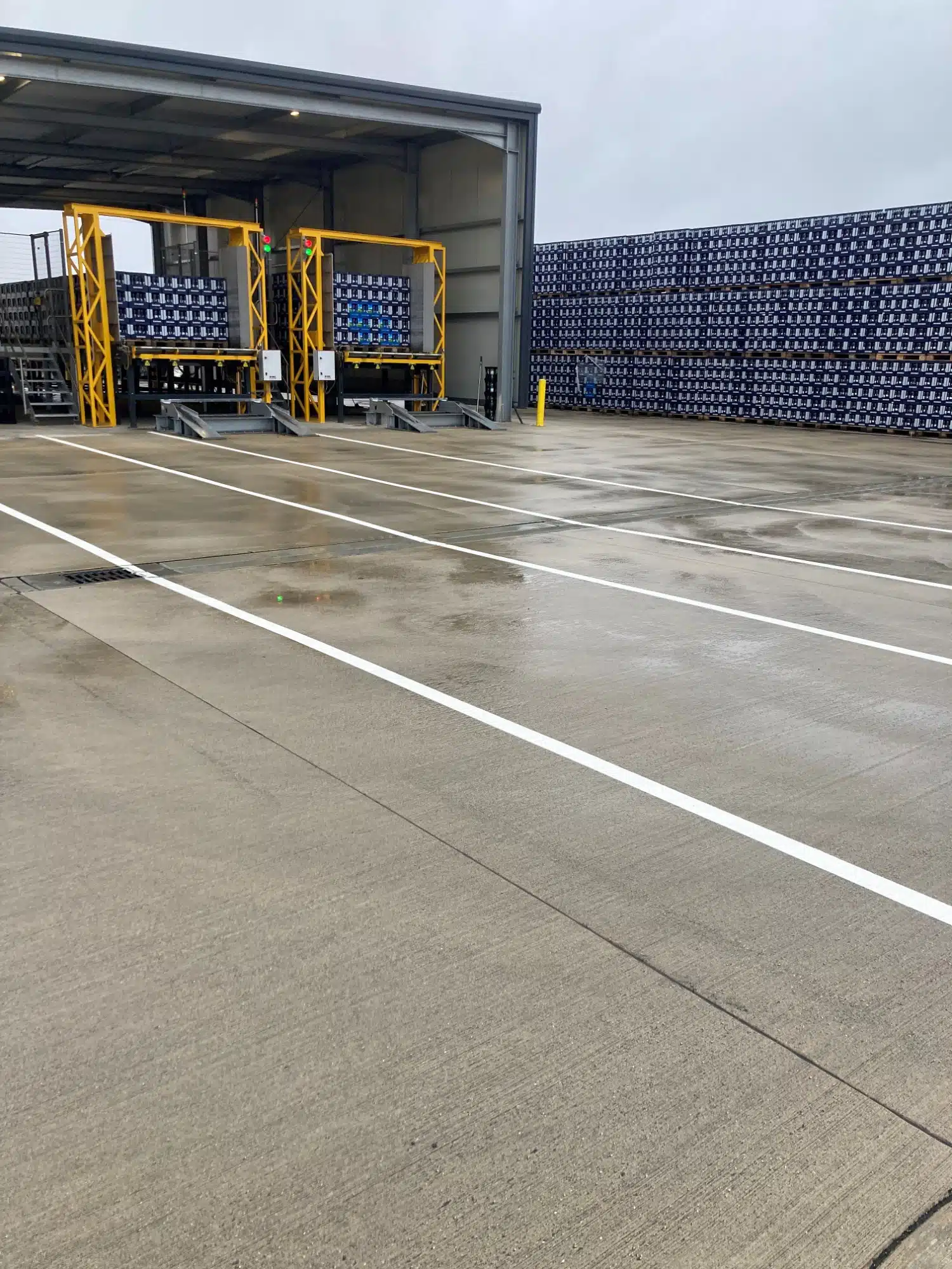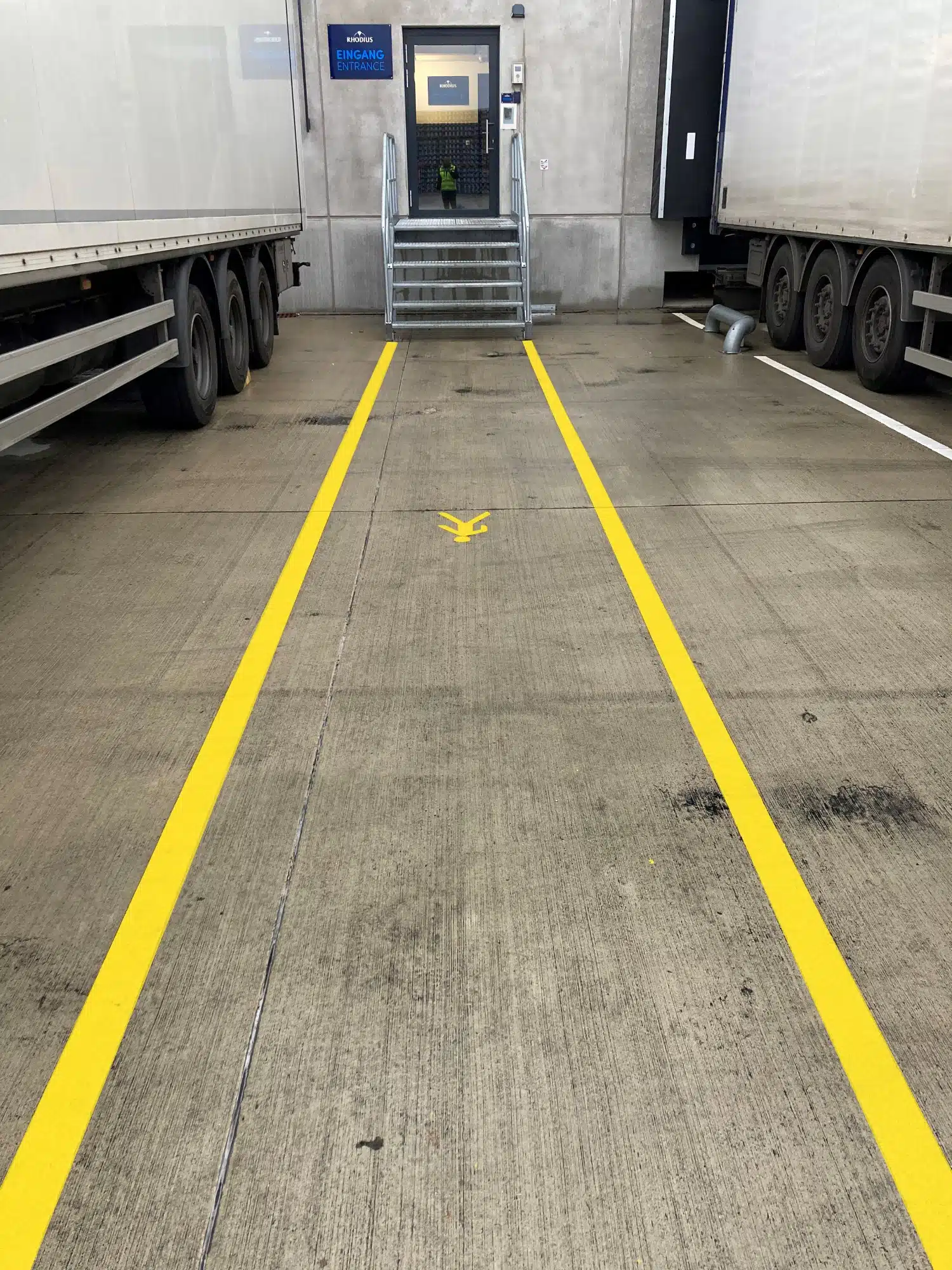 Seit 2015 liefert ONK Etiketten und Schilder an RHODIUS, zunächst für Kennzeichnungen in der Produktion und später im Zuge der Einführung des neuen Lagerverwaltungssystems. Daher war ONK auch beim Neubauprojekt gesetzt. Zu den vergebenen Aufgaben gehörten dieses Mal die Beschilderung der Stellplätze im Blocklager sowie Bodenmarkierungen zur Kennzeichnung von ca. 6.100 laufenden Metern Fahr- und Fußwegen und Blocklagerflächen. Ausgeführt wurden diese mit 2-Komponenten-Straßenmarkierungsfarbe in zwei Farbtönen: Weiß für Blockmarkierungen und Lkw-Spuren, Gelb für Fußwege. Versiegelt wurden die Flächen mit UV-Klarlack. Dies dient der Reduzierung von Absatzstrichen sowie von Gummiabrieb durch Gabelstapler und Autoreifen. Darüber hinaus ermöglicht die Versiegelung eine bessere Reinigung der Markierungen. „Im Außenbereich war uns eine gute Sichtbarkeit der Markierungen bei Dunkelheit wichtig. Die von ONK aufgebrachten Bodenmarkierungen enthalten dort deshalb reflektierende Glasperlen“, so Spindler.