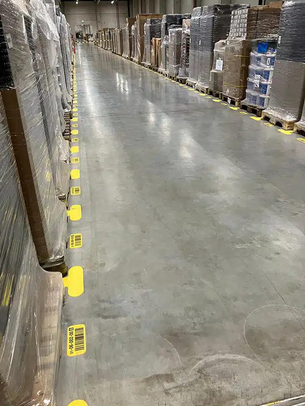 - Bodenmarkierungen bedruckt mit Barcodes für die eindeutige Zuordnung von Stellplätzen im Blocklager