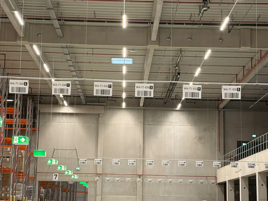 - Von der Hallendecke abgehängte Schilder zur weithin sichtbaren Kennzeichnung von Stellplätzen im Blocklager